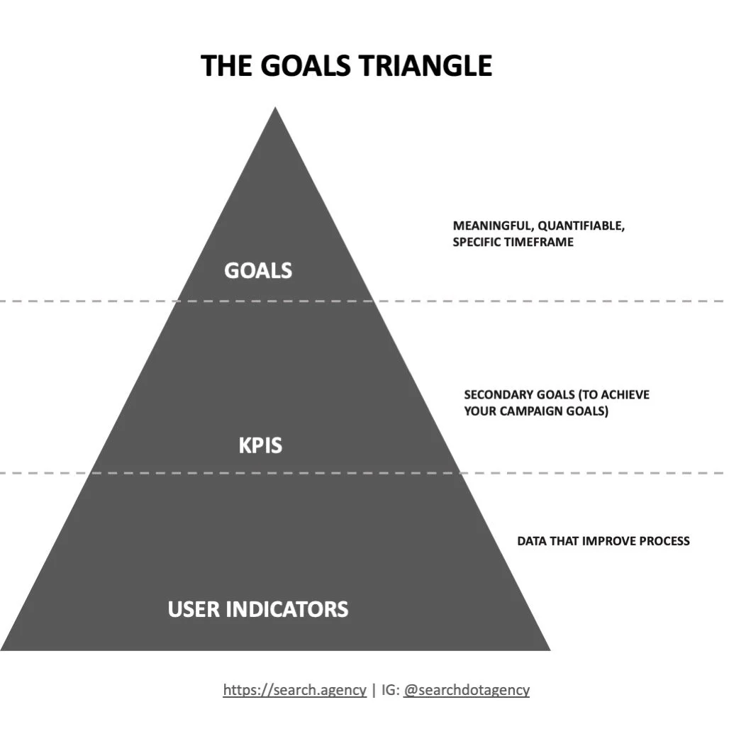 Set up clear campaign goals and objectives. I'm using these goal triangles for this. Each layer of the triangles represents specific metrics important for your business.